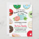 A whimsical collection of holiday-themed doughnuts and a cup of hot cocoa frames this holiday party invitation. Featuring a Santa belt, Christmas lights, snowflakes, and festive colours marshmallows, and sprinkles