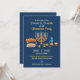 Celebrate Chanukah with doughnuts and dreidels! This invitation highlights elements of a fun Hanukkah party including a menorah, gelt, dreidels, challah, and doughnuts (sufganiyot) against a rich blue background. The matching back features a Star of David pattern against blue. Available with matching products.