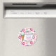 A cute customised birthday party thank you magnet. A yummy with a delicious pattern design. Glazed pink doughnuts with sprinkles. Mouth watering cupcakes in pink and blue with rosettes and strawberries on top. Some pastel pink french pastry macarons and little pink candy buttons also decorate this pattern full of sweet treats. A whimsical frame in a hand drawn style in the centre for you to personalise with your name. With a mint green ice cream cone off to the side