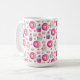 A mug with a delicious pattern design. Glazed pink doughnuts with sprinkles. Mouth watering cupcakes in pink and blue with rosettes and strawberries on top. Some pastel pink french pastry macarons and little pink candy buttons also decorate this pattern full of sweet treats.