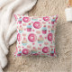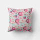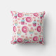 A yummy pillow with a delicious pattern design. Glazed pink doughnuts with sprinkles. Mouth watering cupcakes in pink and blue with rosettes and strawberries on top. Some pastel pink french pastry macarons and little pink candy buttons also decorate this pattern full of sweet treats.