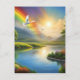 An image of a dove flying over a serene landscape with a rainbow in the sky.