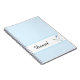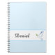 Custom name notebook is shown in a light blue colour with a accent strip with a dove print and a sample name.