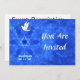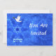 Invitation for a Bar/Bat Mitzvah, a wedding, or other event. Features "shalom" (Hebrew "peace") and a dove carrying a bit of olive branch in its beak on a nice blue and white fractal background which is reminiscent of birds wings. The background image as well as the dove and Hebrew text are independent elements allowing for them all to be sized, rotated or otherwise moved.