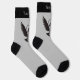 Flying dove with simple key icon. Custom background colour. Custom top stripe colour. Custom monogram. Custom text on each sock.