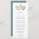 Share your wedding reception menu details in elegant style with these coastal wedding menu cards in white with navy lettering and a trio of aqua and ivory watercolor oyster shell illustrations. Add your initials and wedding date to the top, then customise the menu items arranged by course. Available professionally printed and shipped, or as a digital download for printing locally or at home.