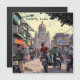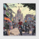 Comic book style ai illustration of downtown area of Kolkata, India Parked motor bikes and cards. A magnet with an illustration of busy downtown street with buildings, restaurants, shops and people on their motor bikes.