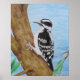 This poster depicts a watercolor pencil drawing of a downy woodpecker standing on a branch, ready to peck it. You can admire the delicate texture and vibrant colours of its feathers, the contrast of its black and white pattern, and the curiosity of its expression.