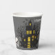 These fun Halloween party paper cups feature a dark haunted house with glowing yellow windows set amidst an eerie graveyard. A bright yellow full moon fills the sky, bats fly around, and a Dracula style vampire stands watch with his arms crossed. Two gleaming white skulls are placed at each end of the scene, and your custom text is in spooky white text at the top.