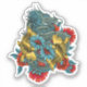 A majestic Chinese dragon is depicted entwined with two vibrant koi fish amidst a bed of blooming flowers. The dragon, with its intricate scales and powerful stance, dominates the composition. Its piercing eyes and open mouth convey a sense of strength and vigilance. The koi fish, one golden and the other black, swim gracefully around the dragon, symbolising perseverance and determination. The vibrant colours of the flowers add a touch of beauty and serenity to the scene.