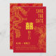 A unique save the date card featuring a dragon and Phoenix style in gold against a red backdrop.