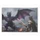 A large, dark purple dragon with massive wings faces a warrior in golden armor, who is holding a sword. The dragon is detailed with spikes and a menacing expression. The warrior is seen from the back, ready to fight. The ground is rocky and fiery, suggesting a volcanic or hellish landscape. The sky is overcast, adding to the dramatic atmosphere of the scene.