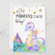 This baby shower invitation dragon design has a sweet dinosaur / dragon with a background of magical gold confetti dot and magical mountains.