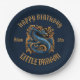 Blue and gold Chinese medieval dragon paper plates for birthday parties, customization for the plate is available under the "personalize" feature to suit any other occasion.
