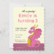 Birthday print scalloped invites with illustration of cute pink dragon; fantasy themed birthday invitation illustrated by Maxi Harmony
