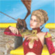 3D digital render of a beautiful Dragon Lady with a little Dragon on her arm on a fairytale castle and a blue sky background