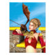 3D digital render of a beautiful Dragon Lady with a little Dragon on her arm on a fairytale castle and a blue sky background