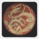 Dramatic vintage fantasy scene in Art Nouveau style features a dragon on dark red within a circle with black background and red accents