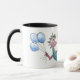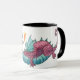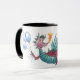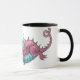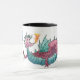 A white mug with black rim and handle and a purple and green dragon from a watercolour painting by Judy Adamson. Matching greeting cards also available.