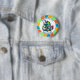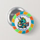 Blue, green, yellow and orange dragon themed boy's birthday boy button. Cute for any little boy who loves dragons! Cute cartoon dragons in birthday hats holding birthday cakes.