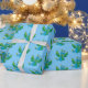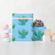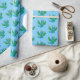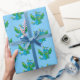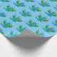 Gift wrapping paper shown in a bright blue colour with a cute dragon print.