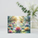 This postcard features a dragonfly gliding over a tranquil pond filled with blooming lotus flowers and lush lily pads. The nature-inspired scene glows with soft sunlight and vibrant botanical detail. Shades of pink, peach, lavender, green, and golden yellow blend beautifully, capturing the magical stillness of a summer morning by the water.