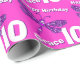 Birthday wrapping paper in bright pink and purple with a stylised dragonfly design. Personalise this dragonfly art birthday paper with your child's name and teenage. Currently reads Happy Birthday Grace 10 today. Ideal for dragonfly or wildlife fans. Design and original art by Sarah Trett.