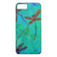 Gorgeous multicolored dragonflies dance on a mottled turquoise background. Cute!