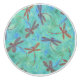 Gorgeous red tinged dragonflies flit around on a mottled turquoise blue and green background.
