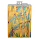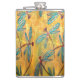 Gorgeous blue and bronze winged dragonflies flit on a mottled golden yellow background.