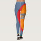 fun red blue orange and black dragonfly leggings with a huge dragonfly down one leg on a red and orange circular pattern.