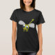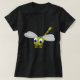 A cheerful cartoon dragonfly with big eyes and vibrant colours on a black t-shirt.