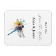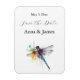 A charming Save the Date magnet featuring a delicate watercolor dragonfly with vibrant, iridescent wings in shades of blue, yellow, and red, adding a whimsical yet elegant touch. The text is beautifully styled in a combination of Emeline and Garamond Roman fonts, blending modern sophistication with timeless classicism. The soft, off-white or ivory background enhances the ethereal watercolor effect, creating a dreamy and romantic aesthetic. Perfect for weddings and special occasions, this sticker captures the beauty of nature with a refined, artistic flair.