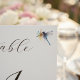 A charming wedding table card featuring a delicate watercolor dragonfly with vibrant, iridescent wings in shades of blue, yellow, and red, adding a whimsical yet elegant touch. The text is beautifully styled in a combination of Emeline and Garamond Roman fonts, blending modern sophistication with timeless classicism. The soft, off-white or ivory background enhances the ethereal watercolor effect, creating a dreamy and romantic aesthetic. Perfect for weddings and special occasions, this table number card captures the beauty of nature with a refined, artistic flair.