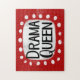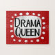 "Drama Queen" is a cute text design in red with black text, along with a white accent shape and white textured whimsical dots surrounding it.