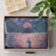 A pale background with filigree frames a peacock surrounded by delicate pink and blue flowers.
