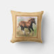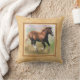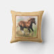 A square throw pillow or cushion with a border frame in shades of beige and light tan, with a digital painting of a cantering sorrel draught horse foal on a pastel coloured background.