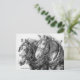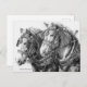 This drawing pays homage to those historical icons known as "heavy horses". Once an integral part of nearly every aspect of our agricultural past, draught (or 'working') horses are now raised and enjoyed for their amazing size, strength, grace and gentleness of temperament. The drawing is executed in pen and ink to accurately capture the beauty of the animals, their patient steadfastness, and the intricacy of the harness that allows control of these 'gentle giants'. This postcard would be perfect for the draught horse enthusiast on your gift list!
