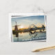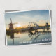 Postcard of two windmills and a drawbridge with reflection in the still water of the canal at sunset in the dutch countryside at the UNESCO world heritage site Kinderdyke, the Netherlands with a white edge and the text 'Greetings from Holland'. The photo is a bit rotated to create the illusion of it laying loose.