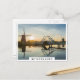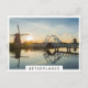 Postcard of two windmills and a drawbridge with reflection in the still water of the canal at sunset in the dutch countryside at the UNESCO world heritage site Kinderdyke, the Netherlands with a white edge and in a white box the text 'Netherlands'.