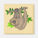 A cute drawing of a brown sloth clinging to a branch with leaves, hanging upside down.