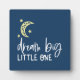 Bring a touch of nighttime magic to any child’s space with this charming tabletop plaque. The deep blue background sets the stage for a glowing crescent moon and scattered stars, creating a peaceful little moment of wonder. Centred beneath the artwork, the phrase “dream big, little one” offers a gentle reminder that even the smallest dreamers can reach for the brightest skies. It's a simple, uplifting piece that brings calm, comfort, and a spark of inspiration to their everyday world. Perfect for a nursery shelf, a kid’s bedroom dresser, or a cosy reading nook, this freestanding plaque adds encouragement without overwhelming the décor. It’s a sweet gift for new parents, baby showers, or anyone who wants to surround a child with positivity and imagination.