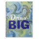 This notebook design features the text Dream BIG in bold lettering of white and dark blue against a background of abstract swirly colours of blue, gold, and green. Makes a great gift for the dreamer in your life.