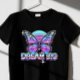 Here’s your Y2K aesthetic t-shirt design featuring glittery chrome 3D text reading "Dream Big" with a cybercore and vaporwave-inspired background, a holographic butterfly, and rhinestone-style sparkles. 🦋✨💎