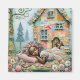A young girl with colourful flowers in her hair is peacefully sleeping in front of a whimsical house made of various colourful paper scraps. Swirling trees and blooming flowers surround the scene, creating a dreamlike atmosphere. Digital Art