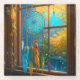 Pretty blue and orange boho dreamcatcher with feathers and beads hanging in a window with pretty outdoor scene. Ai used in illustration style.