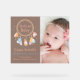 Bohemian tribal dreamcatcher loop with beads and feathers in pastel colours. Gender neutral baby birth announcement card, can be used for either a boy or a girl. Customise with your baby photo and information.