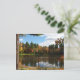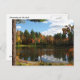 This lovely postcard features a young woman sitting and dreaming on the dock at the edge of a large pond. Autumn is in the air. The water is surrounded with trees in gorgeous fall foliage colours of yellow, green, red, orange and gold. The blue sky has fluffy white clouds and all this is reflected in the water. The trunk of a large pine tree defines the left side. The brilliant sunshine is reflected in her red hair.