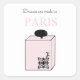 A bottle of designer fragrance in a soft pink color accented by the saying, 'Dreams are made in Paris' Customize by changing the words as desired.