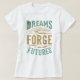 The t-shirt features the text "Dreams Forge Futures" in a vibrant, multi design. Each word is a different colour, creating a dynamic and eye-catching look.